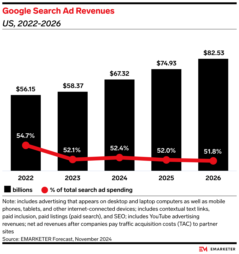 - Perhaps the most potent threat to Google’s market lead is an August ruling from a US Justice Department lawsuit, which found that the company operates an illegal search monopoly. In a second trial, the DOJ suggested that Google should sell Google Chrome, the largest web browser in the world by market share, which could significantly reduce its advertising capabilities.