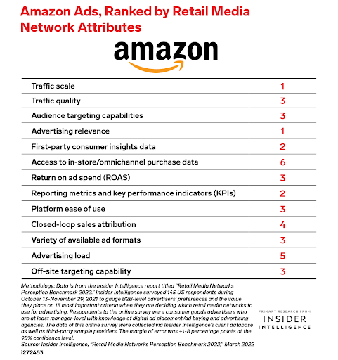 Amazon Ads is the 800-pound gorilla of the retail media space, with most of its revenues coming from sponsored products that are on their way to dominating the market. Despite having by far the highest ad loads in the industry, Amazon does not appear to have turned customers away. That’s because of its best-in-class ad relevance.