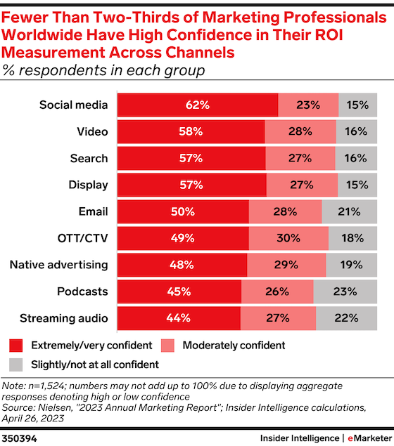 Most marketers worldwide are either extremely or moderately confident in their ability to measure ROI across channels, according to April 2023 Nielsen data. But there’s still room for improvement, with more than 20% of marketers not confident in their ability to measure ROI across email, podcasts, and streaming audio.
