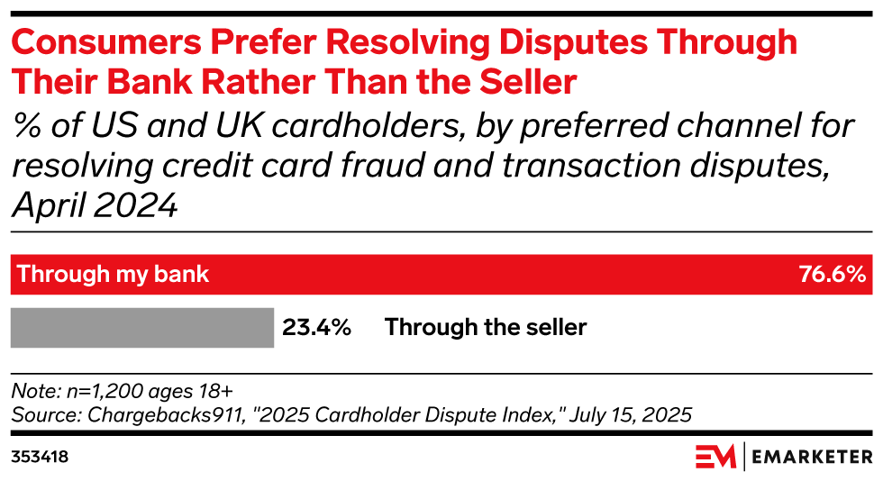 The news: 79.64% of consumers prefer going straight to their bank to resolve a dispute rather than engaging the merchant in question, per a survey by Chargebacks911.