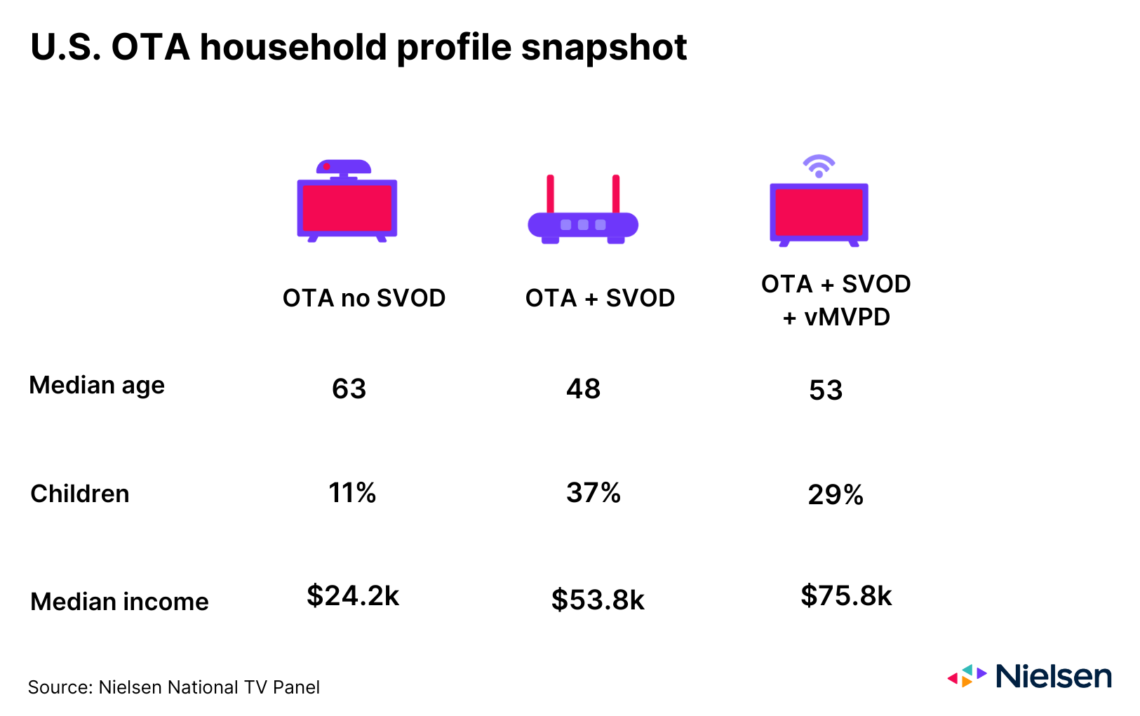 Combined with person-level demographic information from Nielsen’s National TV panel, OTA audience data provides advertisers and agencies with insight that’s out of reach of big data. Nearly 60% of OTA households that don’t subscribe to a subscription video on demand (SVOD) service, for example, are households of one person, while 45% of OTA households that subscribe to an SVOD service but don’t use a vMVPD are home to three or more people. From an income perspective, however, OTA households that subscribe to an SVOD service and use a vMVPD are the biggest earners.