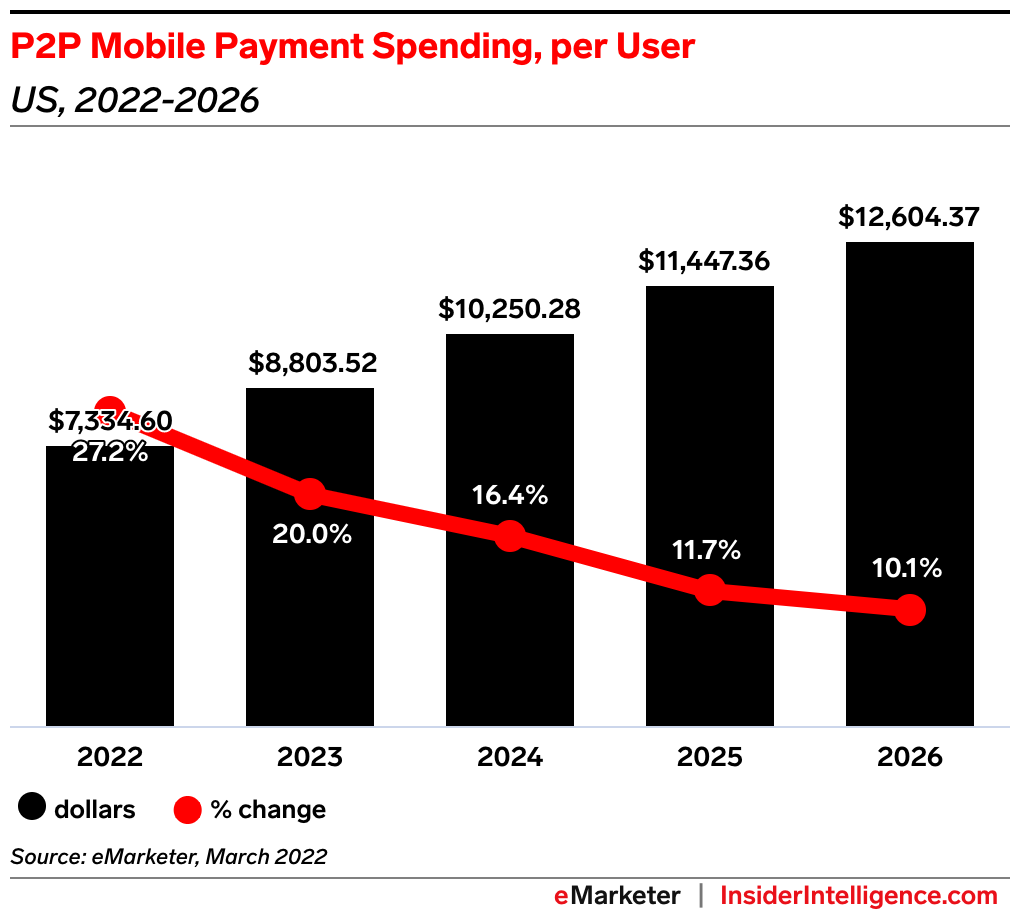 • P2P payments volume is projected to grow nearly 30% in the US this year, per Insider Intelligence’s forecast.