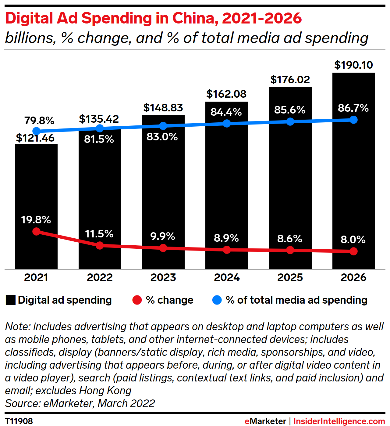 KEY STAT: In 2022, 81.5% of total media ad spending in China will go to digital. No other country in the world focuses on digital to such an extent (the UK will be No. 2 in this regard, at 77.2%). However, the 11.5% spending growth rate will be China’s lowest since we began tracking it.