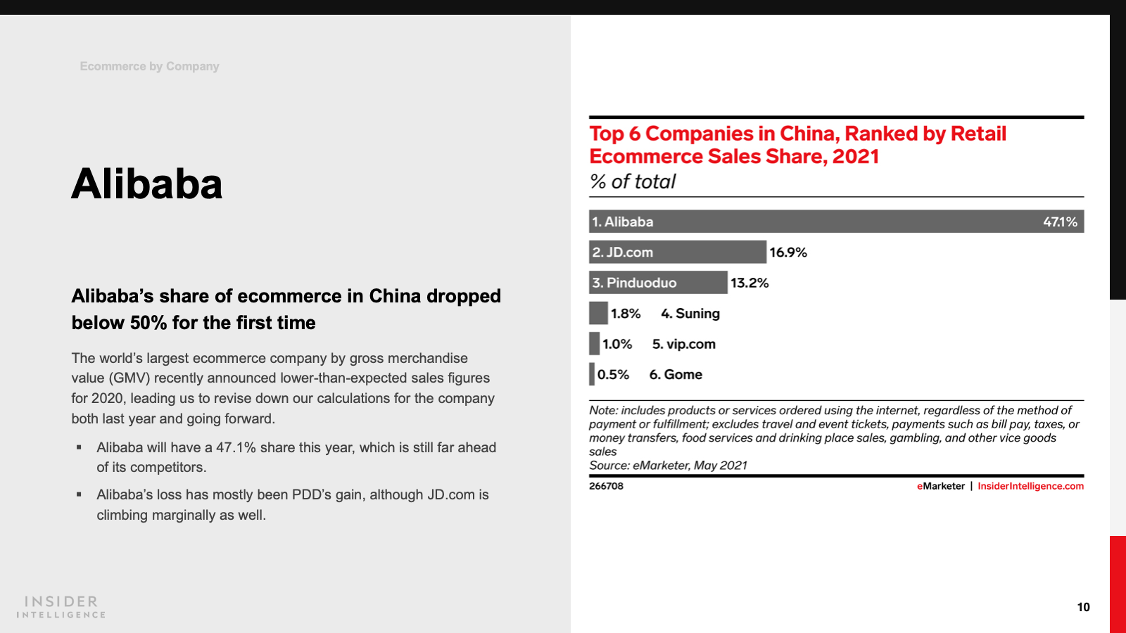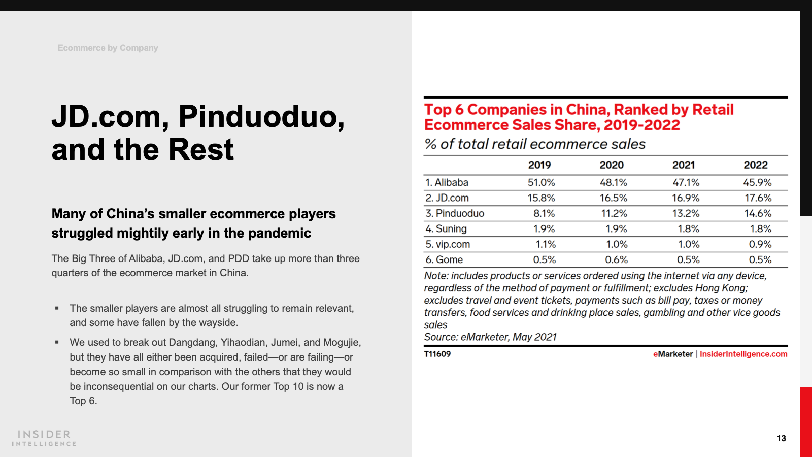 Alibaba remains the biggest ecommerce player in the world by sales but had a disappointing 2020 and saw its share of China’s ecommerce market drop below 50% for the first time. Pinduoduo (PDD) and JD.com are growing much faster. We forecast that in 2021 PDD will claim a 13.2% share and JD.com a 16.9% share. These “Big Three” will account for 77.2% of the market this year.