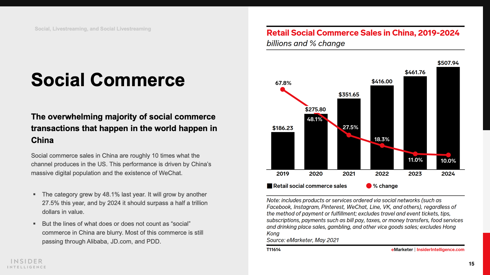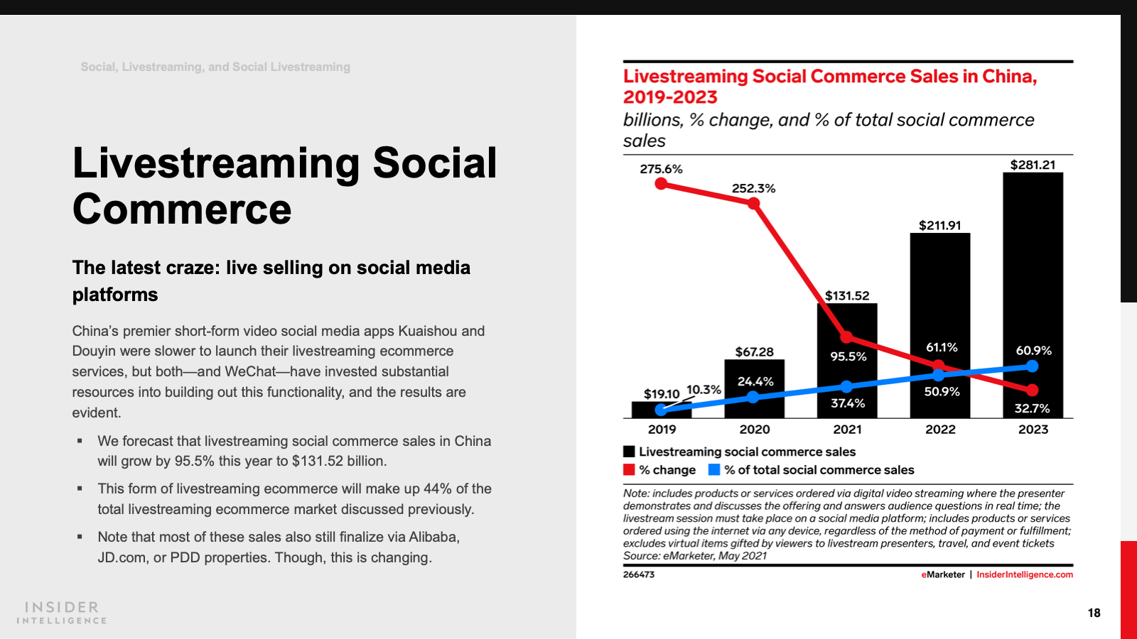China’s social commerce figures are already 10 times what they are in the US at $351.65 billion. But the new story is livestreaming social commerce, which will grow by 95.5% this year and account for more than 50% of social commerce by next year.