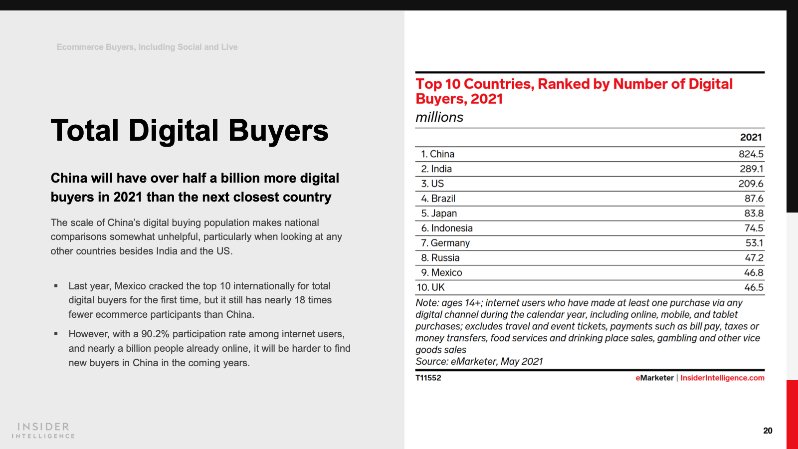 KEY STAT: Retail ecommerce sales in China increased by 20% last year, less than the 27.5% expansion we previously predicted. This year, we anticipate a continued deceleration, down to 18.5% growth.