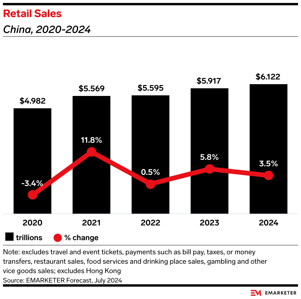 We expect retail sales in China to slow to 3.5% this year, down from 5.8% last year. Growth is forecast to be 3.5% next year as well.