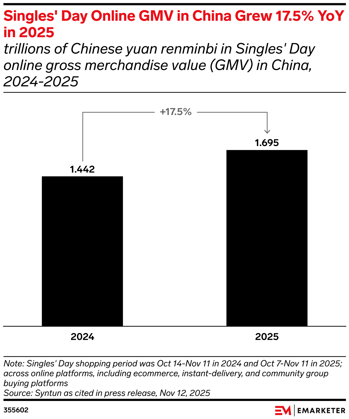 The 2025 event, expanded to five weeks from last year’s 28 days, generated RMB 1.695 trillion ($236.60 billion) in sales, representing a 17.5% YoY increase, per Syntun. But this year’s growth was relatively muted compared with 2024’s 27%. And the gradual extension of the shopping period—from a one-day event in 2009—and the addition of other newer shopping events throughout the year have dampened consumer excitement. Still, sales in China far exceeded our 2025 forecast for both US Black Friday ($12.45 billion) and Amazon Prime Day worldwide ($20.62 billion).