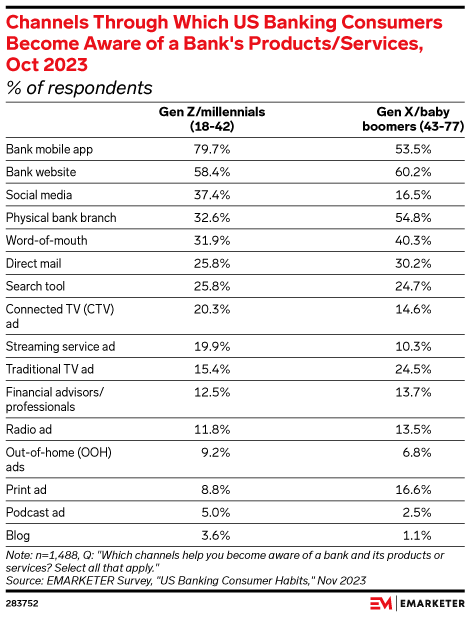Nearly 80% of US banking consumers ages 18 to 42 cited mobile banking apps as a channel where they became aware of a bank’s offerings, per our October 2023 US Banking Consumer Habits survey. That far outweighs the proportions who cited other channels like bank websites (58.4%) and social media (37.4%). Even among banking consumers ages 43 to 77, more than half became aware of products and services via mobile app. That means encouraging greater app usage will help banks maximize cross-marketing opportunities.