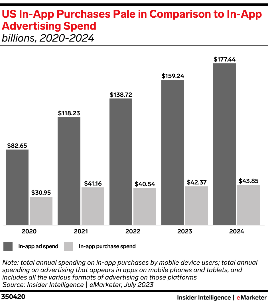IAA will grow even more dominant. The 14.8% growth in IAA translates into an additional $20.52 billion in ad sales. In contrast, the 4.5% increase in IAPs in 2023 means just $1.83 billion in additional revenues for app makers. In fact, the 2023 increase in IAAs alone is almost half the total IAP revenues of $42.37 billion.