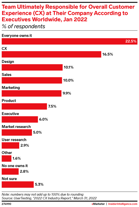 KEY STAT: Only 16.5% of companies have a dedicated team that owns the CX experience, per a March 2022 UserTesting report. The lack of ownership and definition around the CX role leads to worse customer experiences and makes proving its worth difficult.
