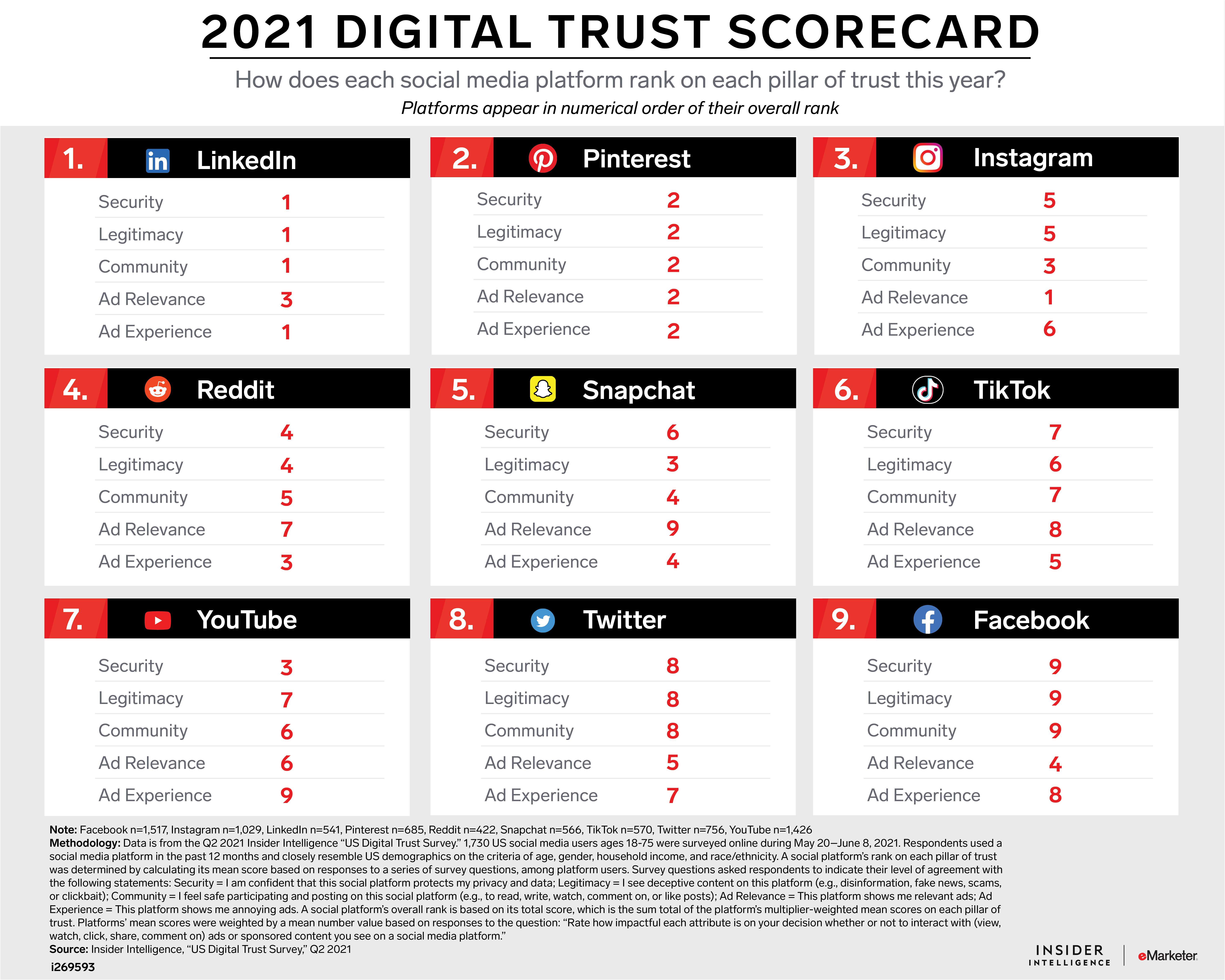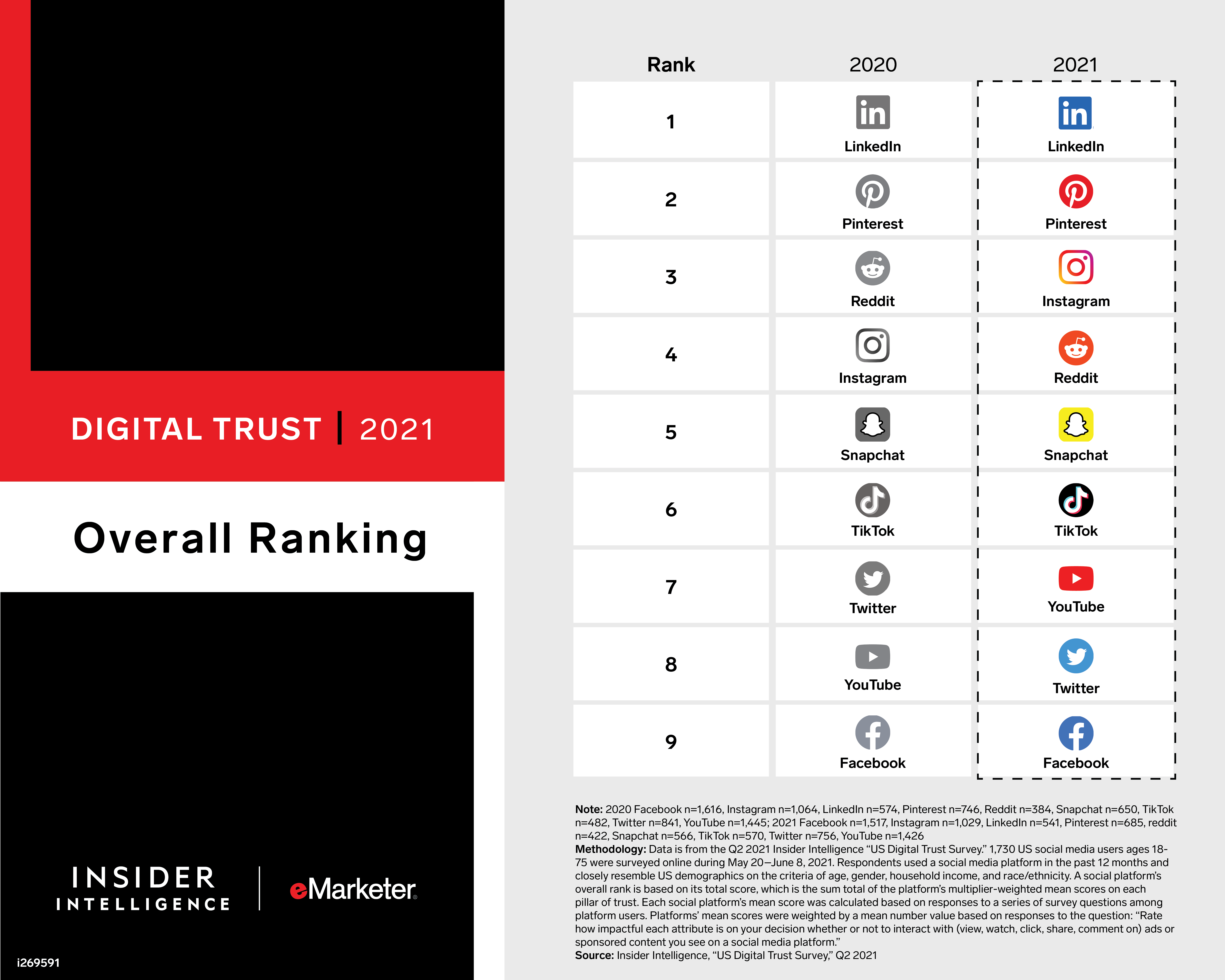 Issues of deceptive content, privacy, and safety continue to plague social media. In this report, we analyze the data from our fifth annual “US Digital Trust Survey" to evaluate how US social media users feel about nine major social media platforms—Facebook, Instagram, LinkedIn, Pinterest, Reddit, Snapchat, TikTok, Twitter, and YouTube—and reveal the extent to which trust affects usage and attitudes toward advertising.