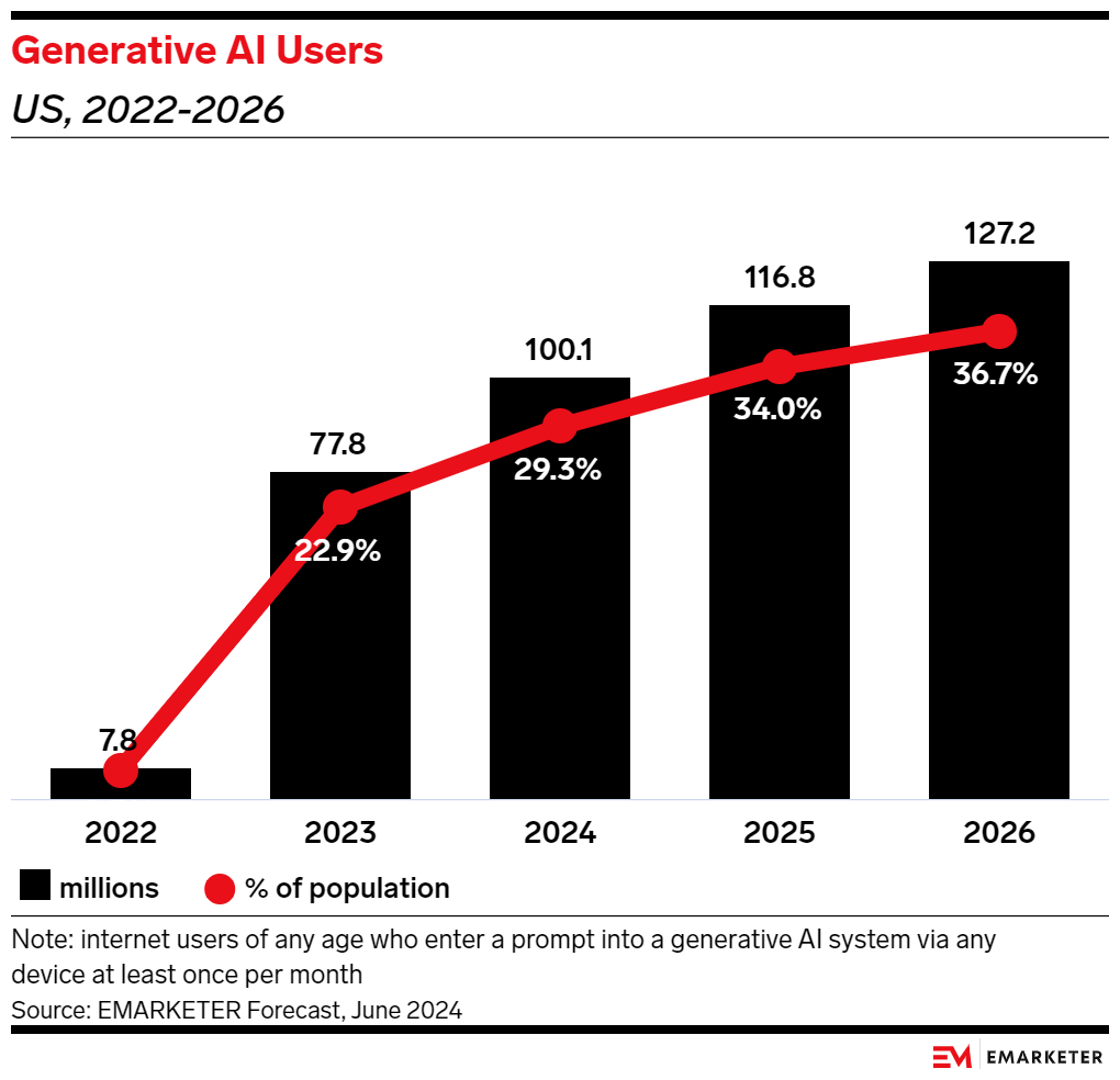 As generative AI (genAI) reshapes how businesses and consumers use digital technologies, the shift also has implications for the advertising industry. The number of genAI users is expected to reach 100 million in 2024, even as growth slows from 2023's blistering pace.