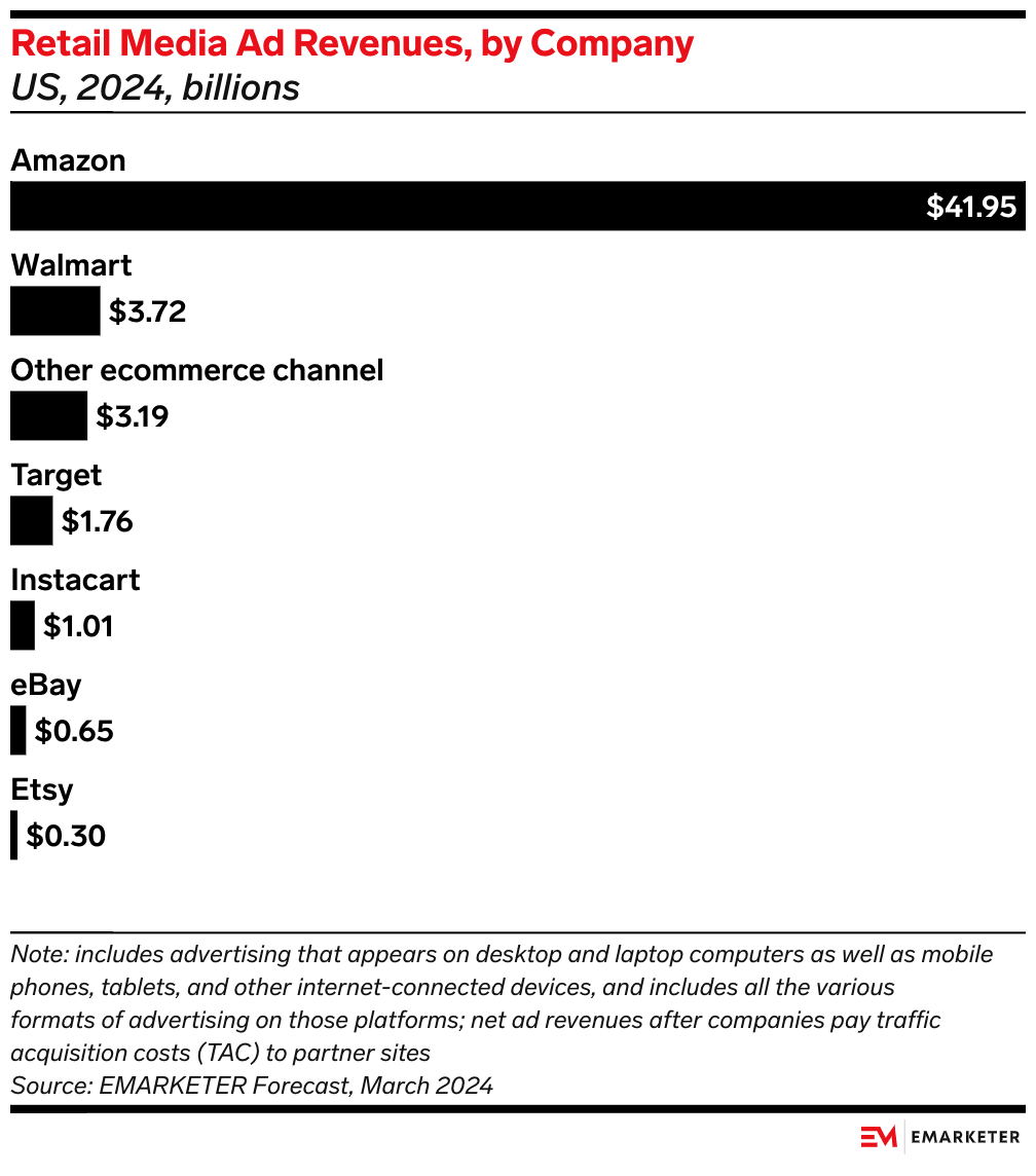 Our take: “Instacart's positioning as a commerce intermediary gives it a significant advantage over other retail media competitors: it can combine granular SKU-level purchase data with cross-merchant shopping behavior,” said Sarah Marzano, EMARKETER principal analyst. “Because Instacart is not a retailer, the margin-rich revenues the company brings in from selling advertising aren’t offsetting the same significant operating expenses as its competitors in traditional retail, and has a greater impact on their bottom lines.”