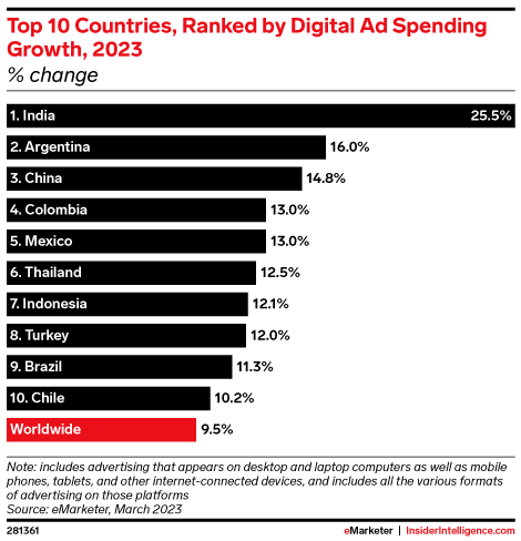 KEY STAT: Five of the six Latin American countries we track will dominate this year’s top 10 in digital ad spending growth. Inflation will fuel Argentina’s growth figures, but gains elsewhere will be genuine.