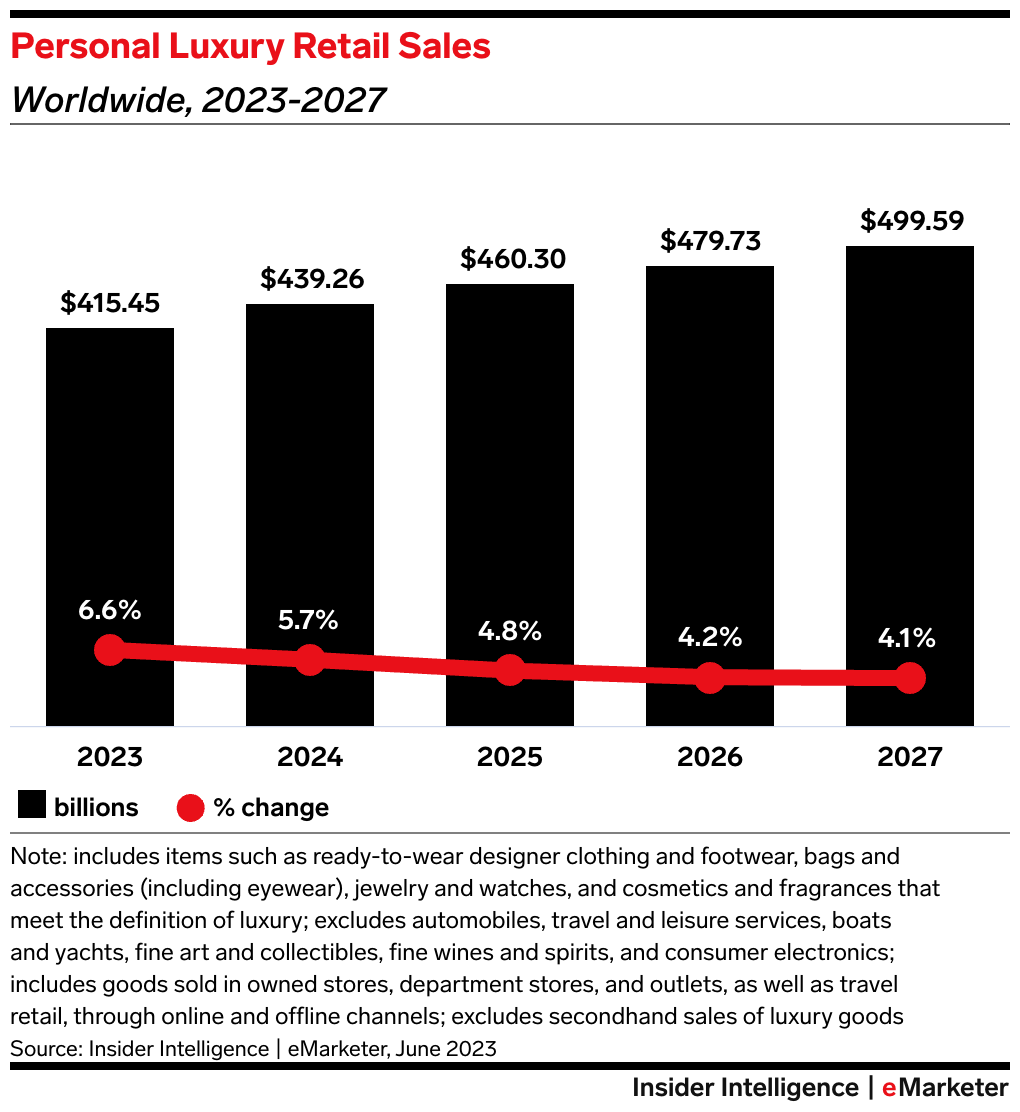 Key Stat: Worldwide personal luxury sales will grow from $415.45 billion in 2023 to half a trillion in 2027. The two largest markets—the US and China—will grow their share to account for 50.6% of total luxury sales by then.