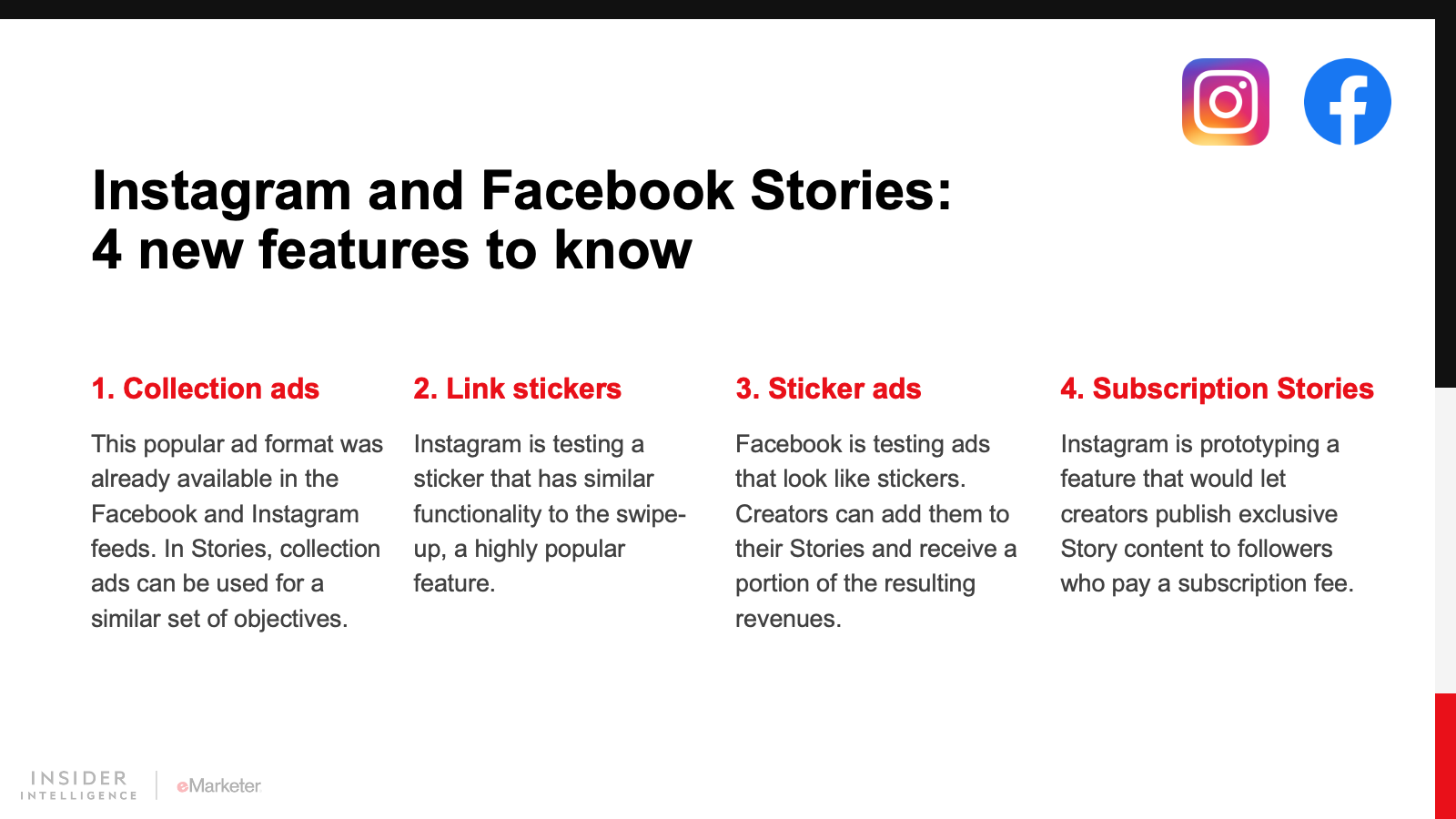 We expect Instagram and its siblings will bring more social commerce features to Stories. We also foresee more video and interactivity. The rise of short-form video is something to keep an eye on, but we believe the uniqueness of the Story format will help it solidify its place as an important venue for social media marketing.
