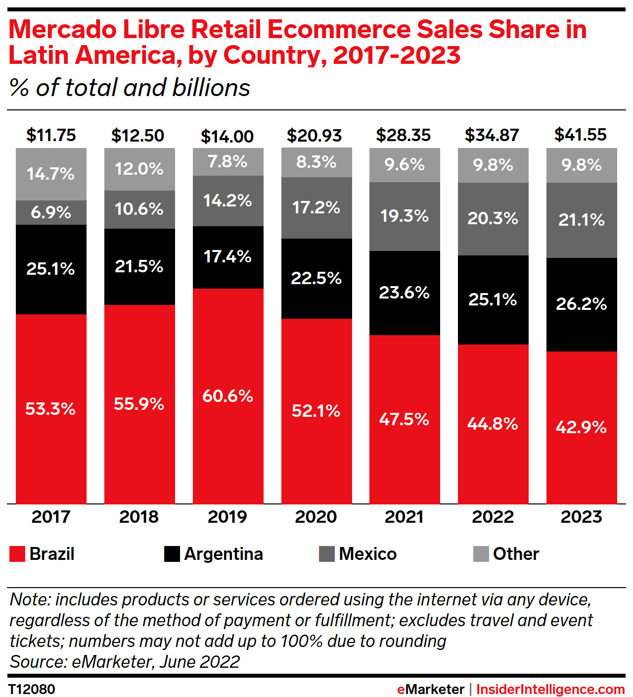 Mobile will propel future growth. Mcommerce sales will continue to eat up a larger share of Mercado Libre’s total digital revenues, representing more than three-quarters (76.1%) of its regional business for the first time this year. That’s 15.2 percentage points higher than mcommerce’s total share of retail ecommerce sales in Latin America.