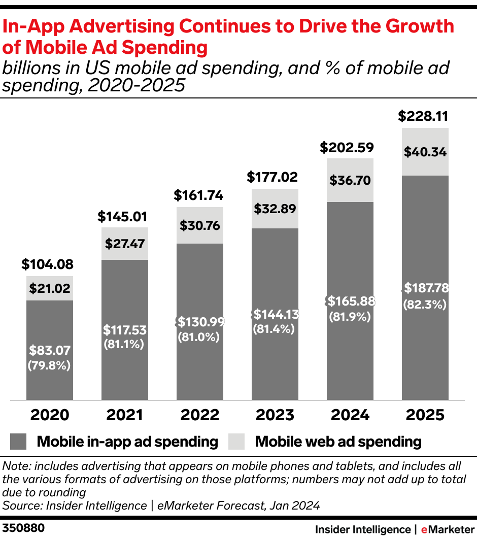 US mobile ad spending will cross $200 billion this year, representing over half (51.2%) of total media dollars spent in the US and nearly two-thirds (66.0%) of digital ad dollars. The vast majority of mobile ad spending will take place in apps.