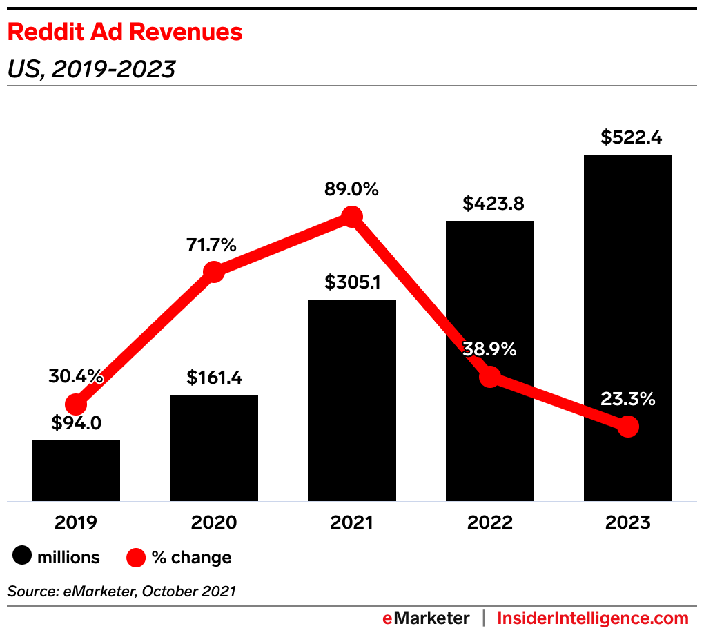 What this means: It’s all likely a part of Reddit’s bigger-picture plan to make the platform more appealing to marketers. Reddit has been doubling down on brand safety, ramping up its ad capabilities, and courting ad agencies in anticipation of going public soon. And it’s worked: We estimate Reddit’s US ad revenues rose 89.0% last year.