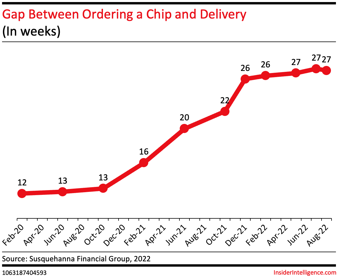 The gap between when a chip is ordered and when it is delivered averaged 26.8 weeks in August, per the Susquehanna Financial Group’s data—a day shorter than the previous month. That’s still a little more than 14 weeks behind delivery times at the onset of the pandemic.