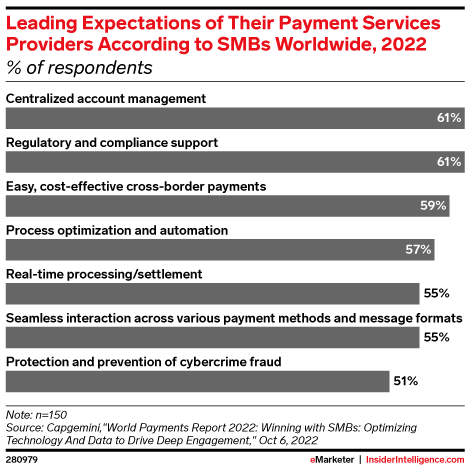 KEY STAT: SMB expectations of their PSPs are ramping up as they demand new services—especially centralized account management (61%), new payment methods (59%), and optimization (57%).