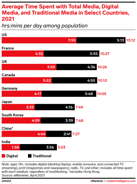 WHAT’S IN THIS REPORT? This report summarizes and compares our latest forecasts for time spent with media across nine countries: the US, Canada, France, Germany, the UK, China, India, Japan, and South Korea. We highlight our estimates for digital media versus traditional media, with a focus on digital video versus TV.