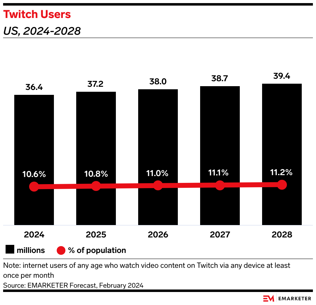 Its community—rooted in video games but expanding into esports, music, talk shows, and even cooking—attracts a diverse base of creators, resulting in high watch-time numbers. We forecast that Twitch will have 36.4 million users by the end of 2024, accounting for 10.6% of the US population.