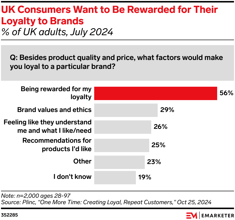 Key Stat: Loyalty programs can boost retention: More than half (56%) of UK adults say they would be more loyal to a particular brand if they were rewarded for their loyalty.