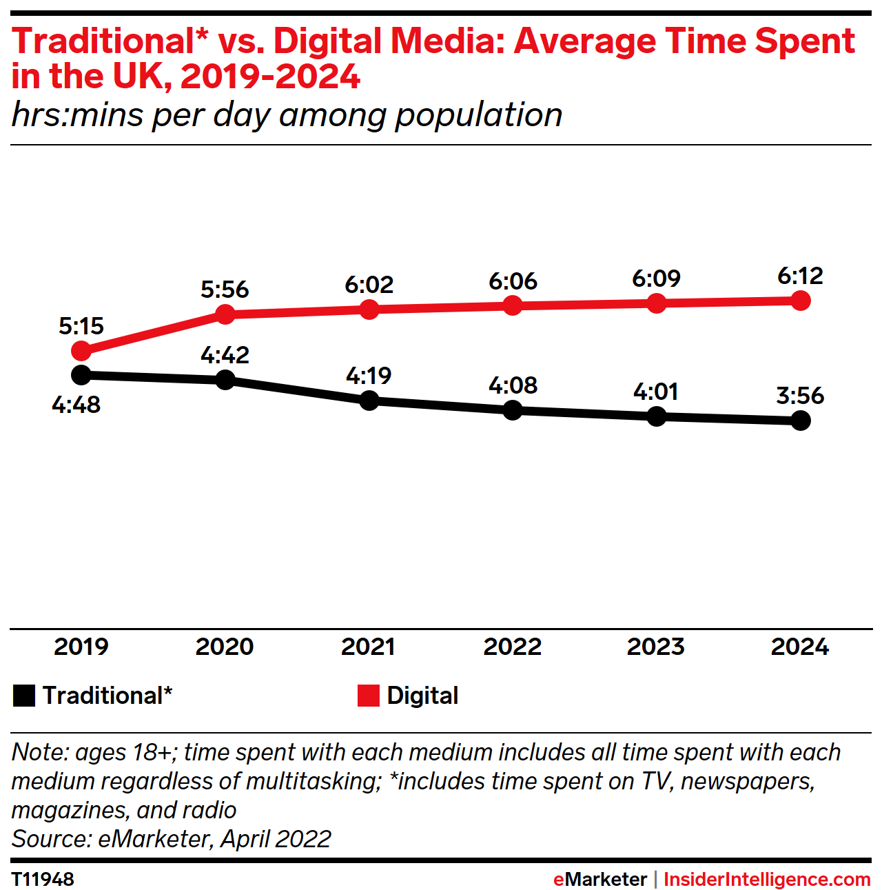 KEY STAT: UK consumers spend nearly 2 hours more with digital media versus traditional, according to our forecast. And the gap will only widen over the next two years.