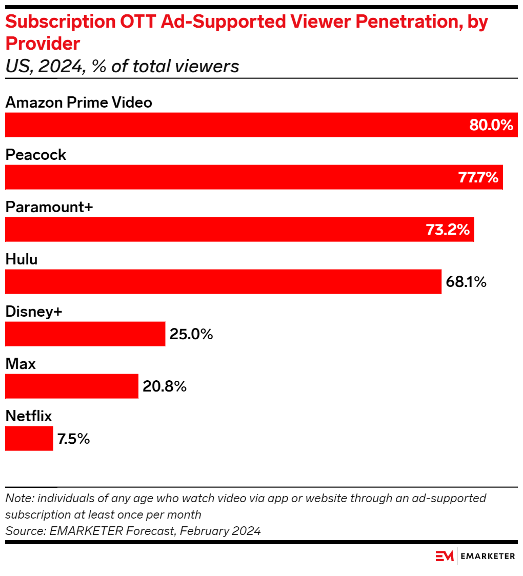 Key Stat: A full 80.0% of US Amazon Prime Video viewers will be ad-supported in 2024, a higher share than any other subscription streaming service.