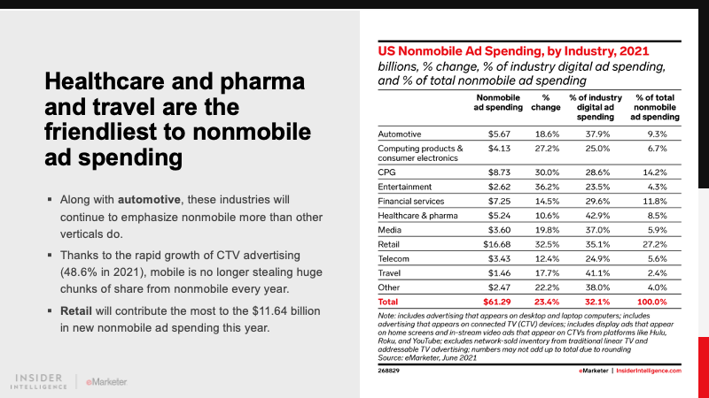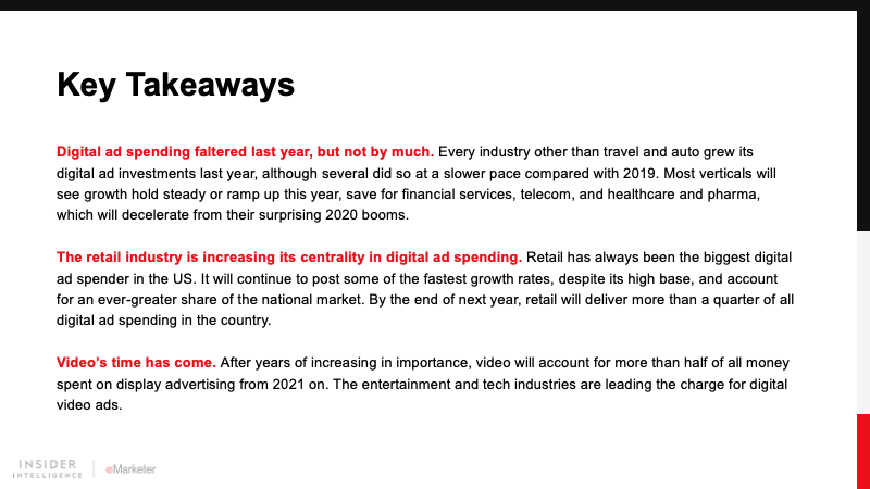 KEY STAT: Entertainment, retail, and CPG will all increase their digital ad spending by more than 30% this year. Travel’s will rebound, but only modestly. Healthcare and pharma’s spending growth will decelerate considerably.