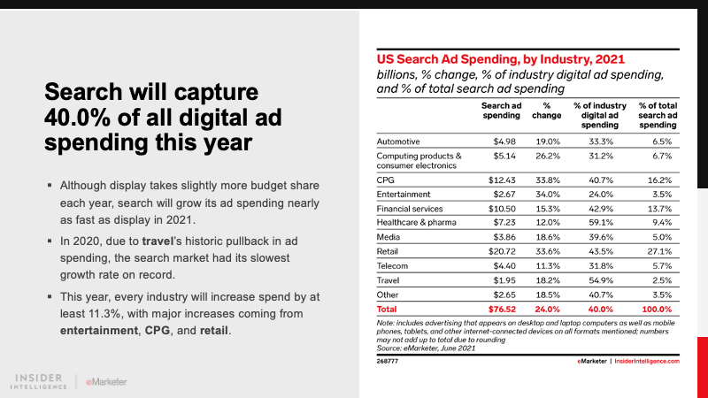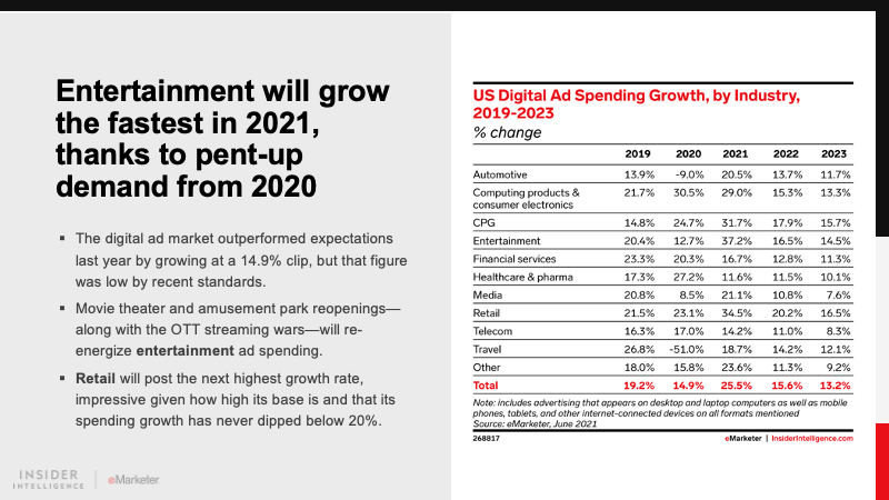 Entertainment had a difficult run last year, and it entered 2021 with plenty of pent-up ad buying demand. Its digital ad outlays will rebound by 37.2% this year, while retail will see the second-fastest growth (34.5%). Consumer packaged goods (CPG) will be the only other vertical to produce a comparable rate (31.7%).