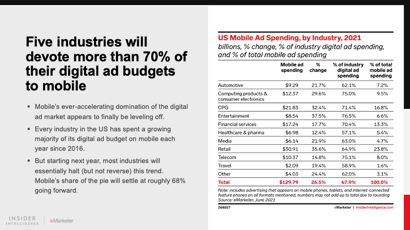 This year, mobile will capture $129.79 billion in spending and level off with about 68% of the digital ad market, after years of stealing share from nonmobile digital formats. Retail will once again be the biggest mobile spender in 2021, accounting for 23.8% of the mobile ad market.