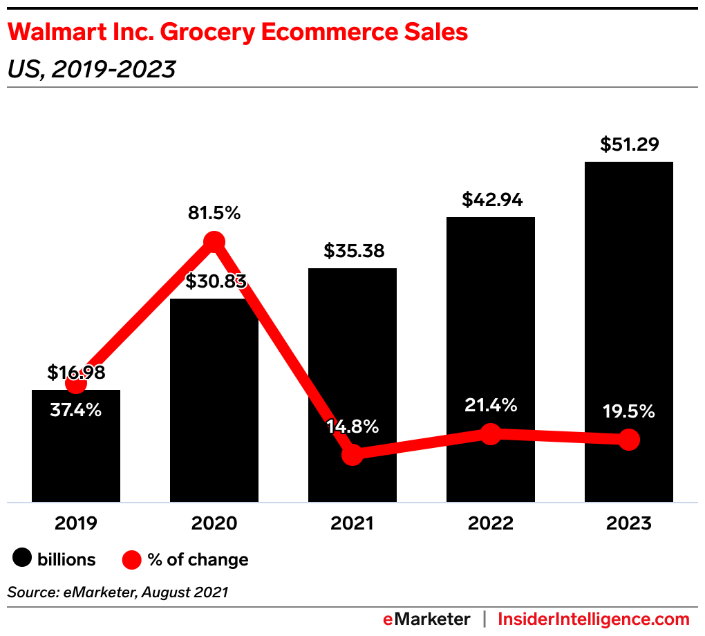 - But the companies’ share of total grocery ecommerce sales are pretty even—Amazon’s 21.0% to Instacart’s 21.8%.