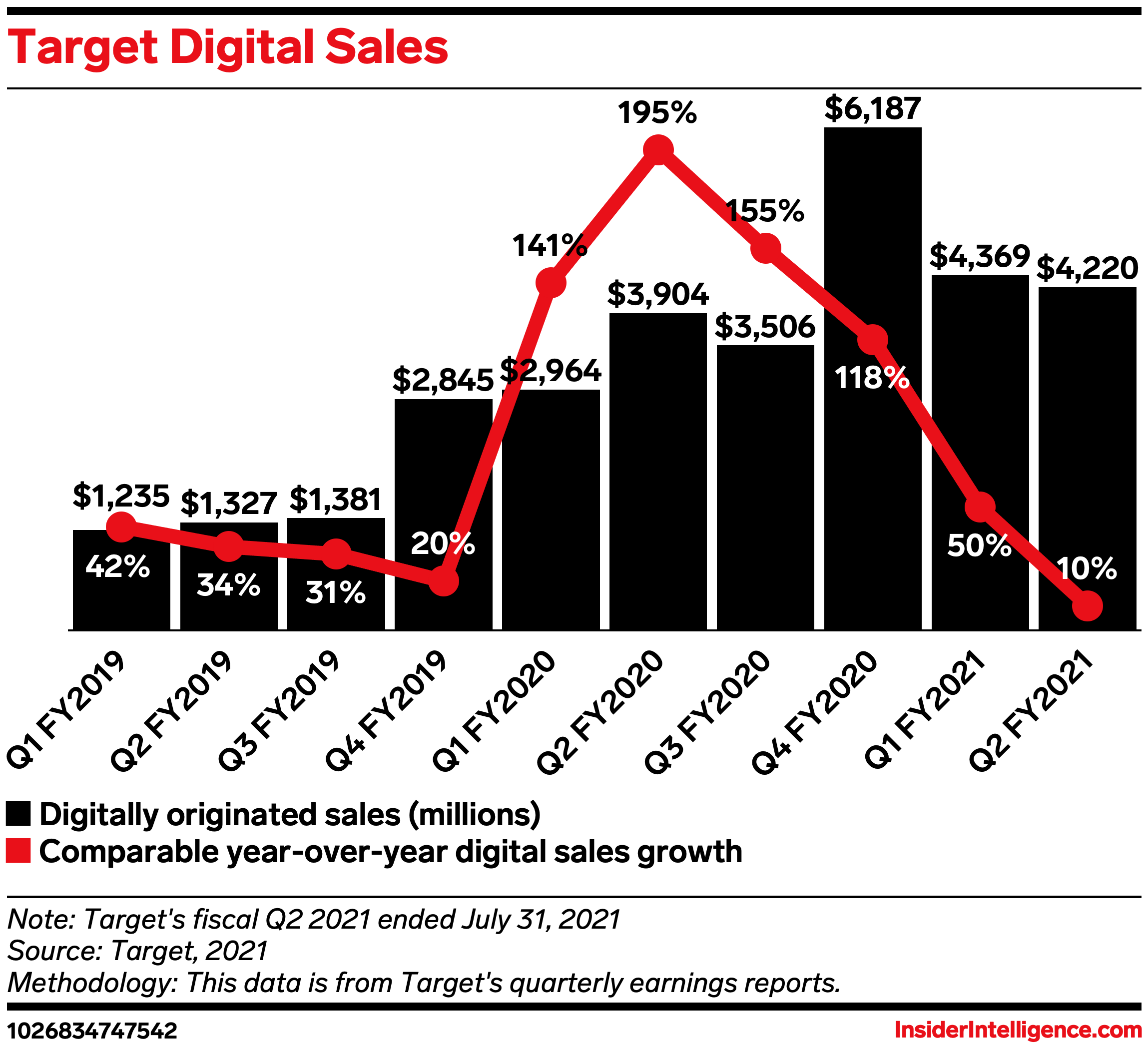 By the numbers: Target’s total comparable sales grew 8.9% year over year (YoY), hitting $24.83 billion in its fiscal Q2 2021 (ended July 31, 2021), per its recent earnings report. This represents a slowdown from the same period last year when the metric increased 24.3% YoY—likely because the closure of other stores at that time pushed more traffic to Target.