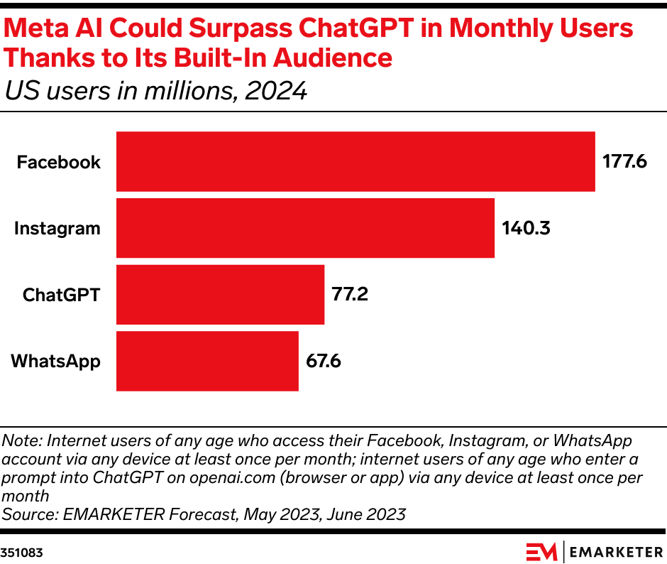 - Meta AI has a built-in audience. Fewer than half (43%) of US Facebook users need to use Meta AI at least once per month for it to be as big as market leader ChatGPT, per our estimates. That’s not unthinkable given how prominently Meta AI is now placed in Meta’s apps.