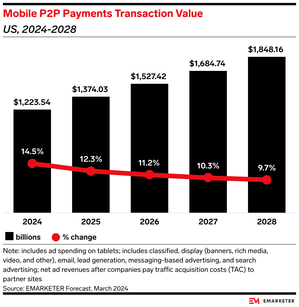 Zelle also remains the largest of all P2P apps. It’s expected to account for 54.6% of total mobile P2P transaction value in 2025, compared to Venmo’s 20.5% and Cash App’s 10.6%, per our forecast. Its size makes its growth even more impressive given its peers have a longer runway to grow their volume.